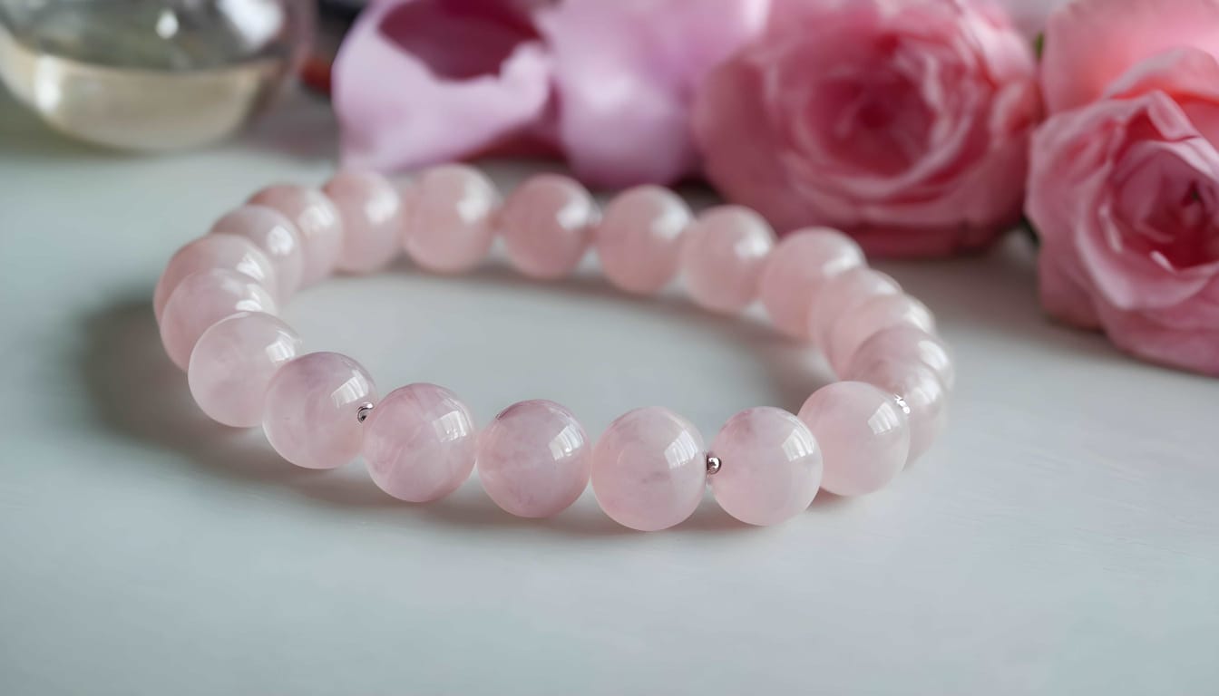 Unisex Rose Quartz healing bracelet crafted to nurture love, emotional healing, and inner peace. Handcrafted by AdiShakti for heart chakra energy and divine softness.