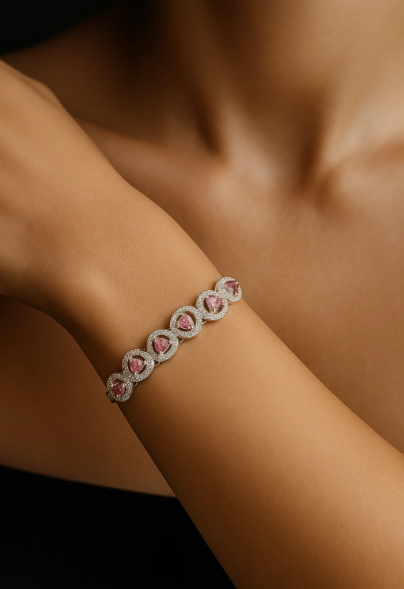 Add a sweet sparkle to your wrist with this elegant bracelet featuring pink heart motifs and American Diamond accents — perfect for gifting and styling.