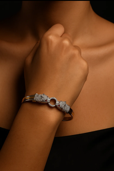 Unisex Italian cut 925 silver bracelet with dual panther heads, ruby-red gemstone eyes, and gold-plated accents in a luxury jewellery box – Adishakti JewelleryItalian Cut 925 Silver Panther Head Bracelet with Ruby Accents