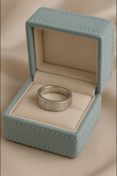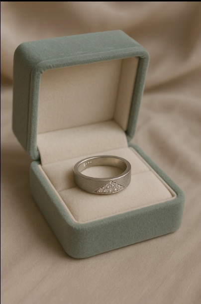 Sterling silver men’s ring with geometric stone accent, displayed in a green velvet jewelry box.Men’s Geometric Textured Silver Ring – AdiShakti Jewellery.